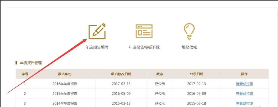 4、登录成功后在新的界面点击“年度报告在线填录”,即可进行年报的填录。个体户,农民专业合作社年报无需申报“其他自行公示信息填报”(个体工商户和农民专业合作社登录,没有“其他自行公示信息填报”这一项)。