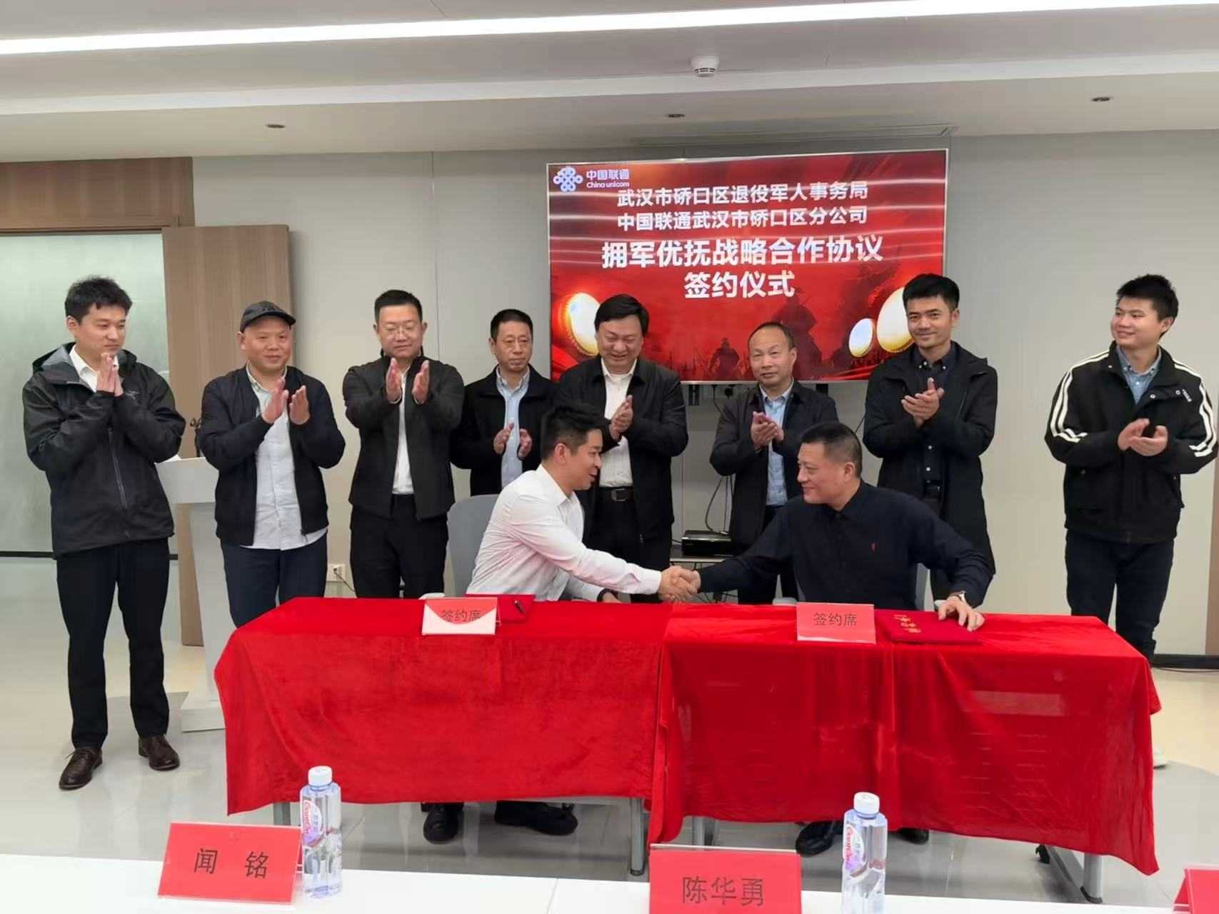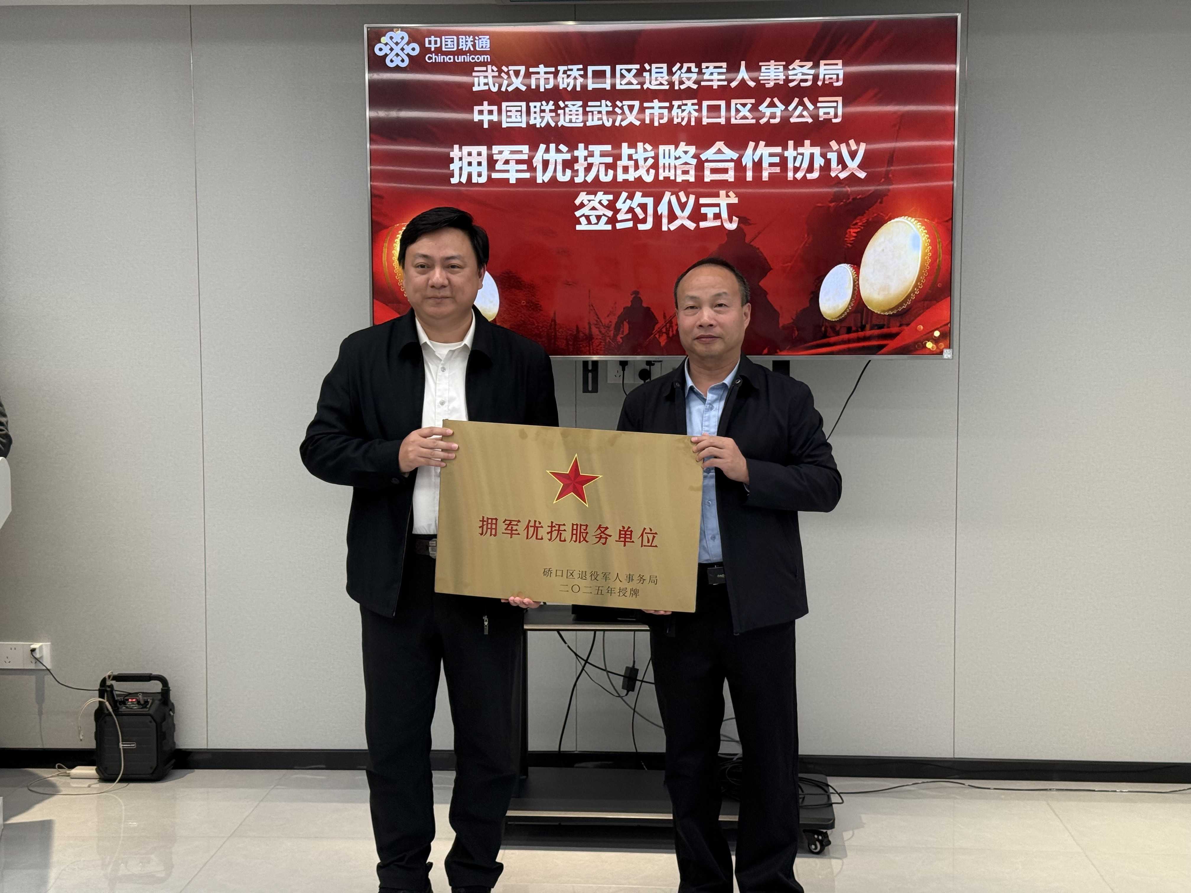 仪式上,双方代表共同签署拥军优抚合作协议,陈华勇向武汉联通硚口区分公司授予“拥军优抚服务单位”铭牌。