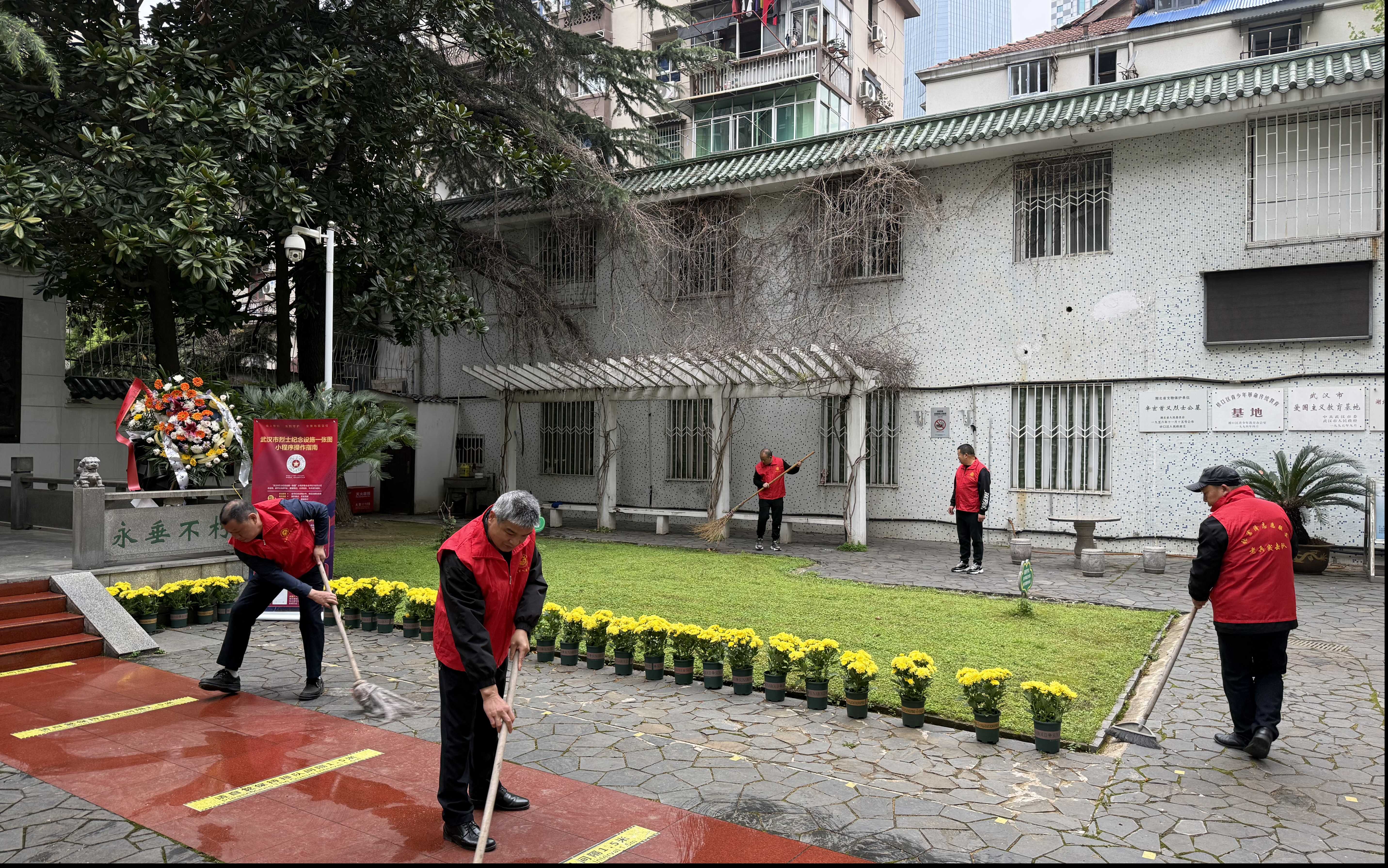 清晨8时,硚口区张富清志愿服务队的队员们自带擦布、水桶、扫把等工具,细致清扫园区道路,认真擦拭墓碑护栏,为即将开始的祭扫仪式营造出整洁肃穆的环境。