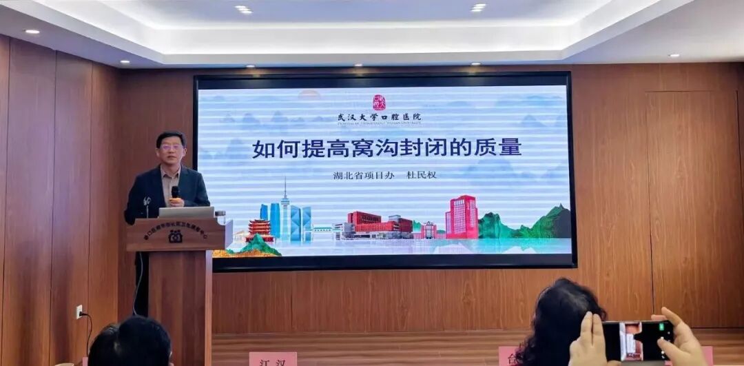 硚口区卫健局相关科室、中心领导以及参与该项目的医务人员齐聚一堂,全力保障项目有序推进。本次培训会特别邀请了武汉大学口腔医院的多位资深专家组成讲师团,课程设计紧密围绕项目核心环节,旨在解决基层工作中的实际问题。武汉大学口腔医院党委副书记台保军教授深入浅出地讲解了面向儿童及家长开展口腔健康教育的科学方法与沟通技巧。她强调,有效的教育是预防的第一步,需根据儿童年龄特点,运用生动有趣的形式,将正确的刷牙方法、饮食习惯等知识传递给每一个家庭,从源头培养爱牙护齿的健康意识。武汉大学口腔医院预防科主任杜民权教授聚焦于窝沟封闭这一关键技术环节,从适应症的选择、术区隔湿与清洁、酸蚀剂的规范使用、封闭剂的涂布技巧到光固化的操作要点,进行了全流程的精细化讲解。他结合常见失败案例,重点分析了影响封闭剂保留率的关键因素,为提升项目核心服务质量提供了明确指引。 武汉大学口腔医院预防科副主任江汉教授详细解读了全国统一的龋病检查诊断标准,确保调查数据的科学性、可比性。同时,系统梳理了项目各类登记表、汇总表的填写规范。湖北省牙防项目办谢思主任强调了资料收集、整理、上报的完整性与及时性,为项目的规范管理和成效评估奠定了坚实的数据基础。理论的价值在于指导实践。本次培训尤为注重实战能力的提升,专门设置了长时间、沉浸式的现场实操环节。