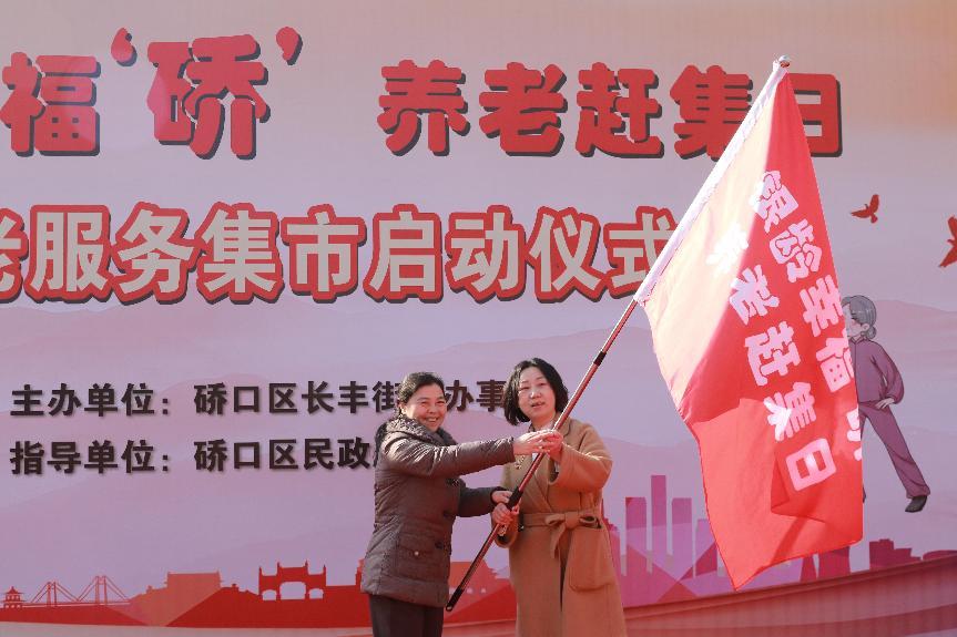 活动在9时30分准时拉开帷幕,老年人社区社会组织带来的精彩文娱表演迅速点燃现场气氛。独唱《等待》歌声悠扬,舞者们用热情洋溢的舞蹈《爱我中华》表达着对祖国的热爱,也展现出老年人积极向上的精神风貌。硚口区民政局领导和长丰街道领导先后登台发言,为大家送上元宵祝福,真挚的话语饱含着对老年人的关怀。民政部门庄重地将“银龄幸福‘硚’养老赶集日”服务队旗交到长丰街道手中,寓意着养老服务工作的接力与传承。