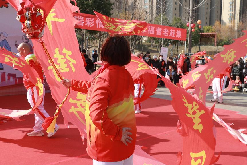 现场腰鼓队的激昂表演,让现场年味愈发浓郁,龙船队、彩带龙的绕场表演更是将活动推向高潮,现场一片欢声笑语。