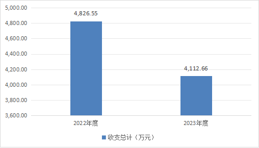 2023年度收、支总计均为4,112.66万元。与2022年度相比,收、支总计各减少713.89万元,下降14.8%,主要原因是2023年无专项债及大型修缮项目支出。