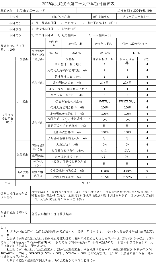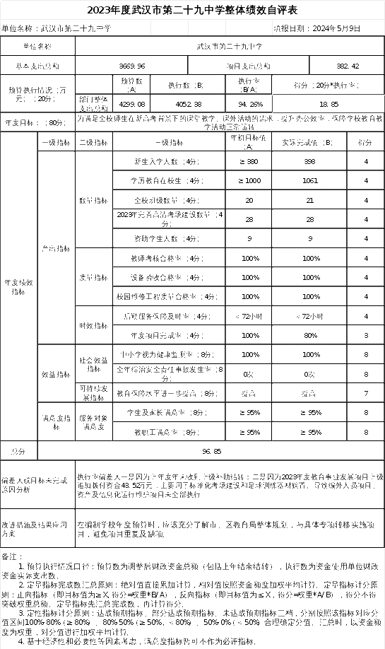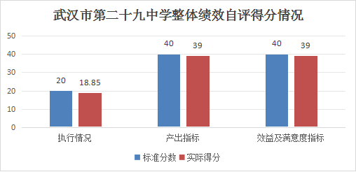武汉市第二十九中学编外人员类,教育事业发展、资产及信息化等项目绩效评价综合得分为96.47分,综合评价等级为优。其中预算资金执行20分,得分17.47分,评价优;产出指标项目40分,实际得分40分,评价优;效益指标及满意度指标项目40分,实际得分39分,评价优。