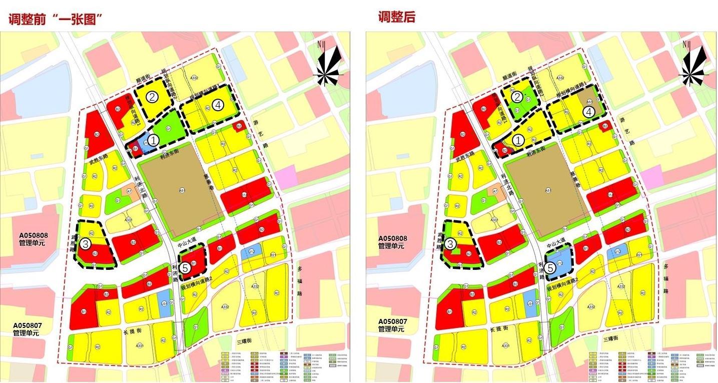 1、拟将A050808管理单元原控规导则中利济东街以北、利济北路以东地块由公园绿地、商业用地、供电用地、道路用地调整为居住用地、公园绿地、商业用地,同时结合方案将规划支路调整为规划公共通道(具体范围如图所示);