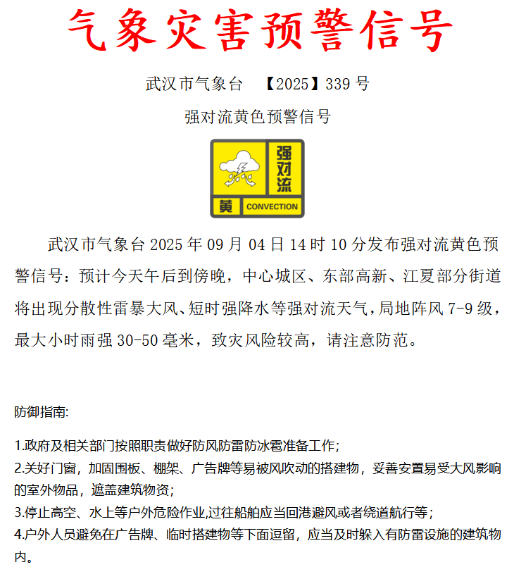 武汉市气象台气象灾害预警信号(2025年9月4日)