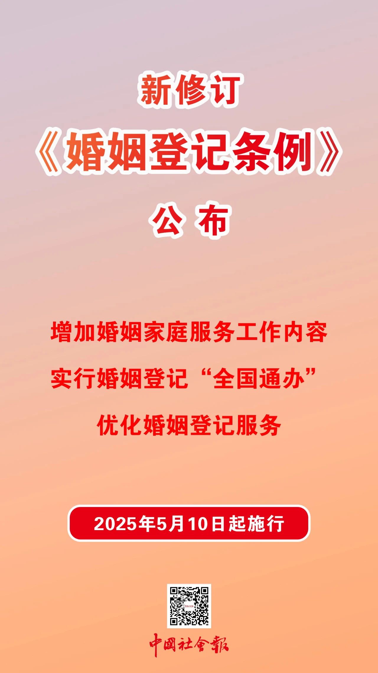 4月9日,新修订的《婚姻登记条例》公布,自2025年5月10日起施行。 条例全文共6章28条,包括“总则”“结婚登记”“离婚登记”“婚姻登记档案管理”“法律责任”“附则”等内容。 条例修订的主要内容包含三个方面:一是增加婚姻家庭服务工作内容,规定县级以上地方人民政府加强综合性婚姻家庭服务指导工作和婚姻家庭辅导服务体系建设,倡导文明婚俗,促进家庭和谐,引导树立正确的婚恋观、生育观、家庭观;二是实行婚姻登记“全国通办”,深化婚姻登记制度改革,进一步提高婚姻登记的便利性;三是优化婚姻登记服务,规定县级以上地方人民政府采取措施提升婚姻登记服务水平,加强婚姻登记场所规范化、便利化建设。