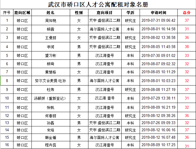 武汉市硚口区人才公寓配租对象名册公示
