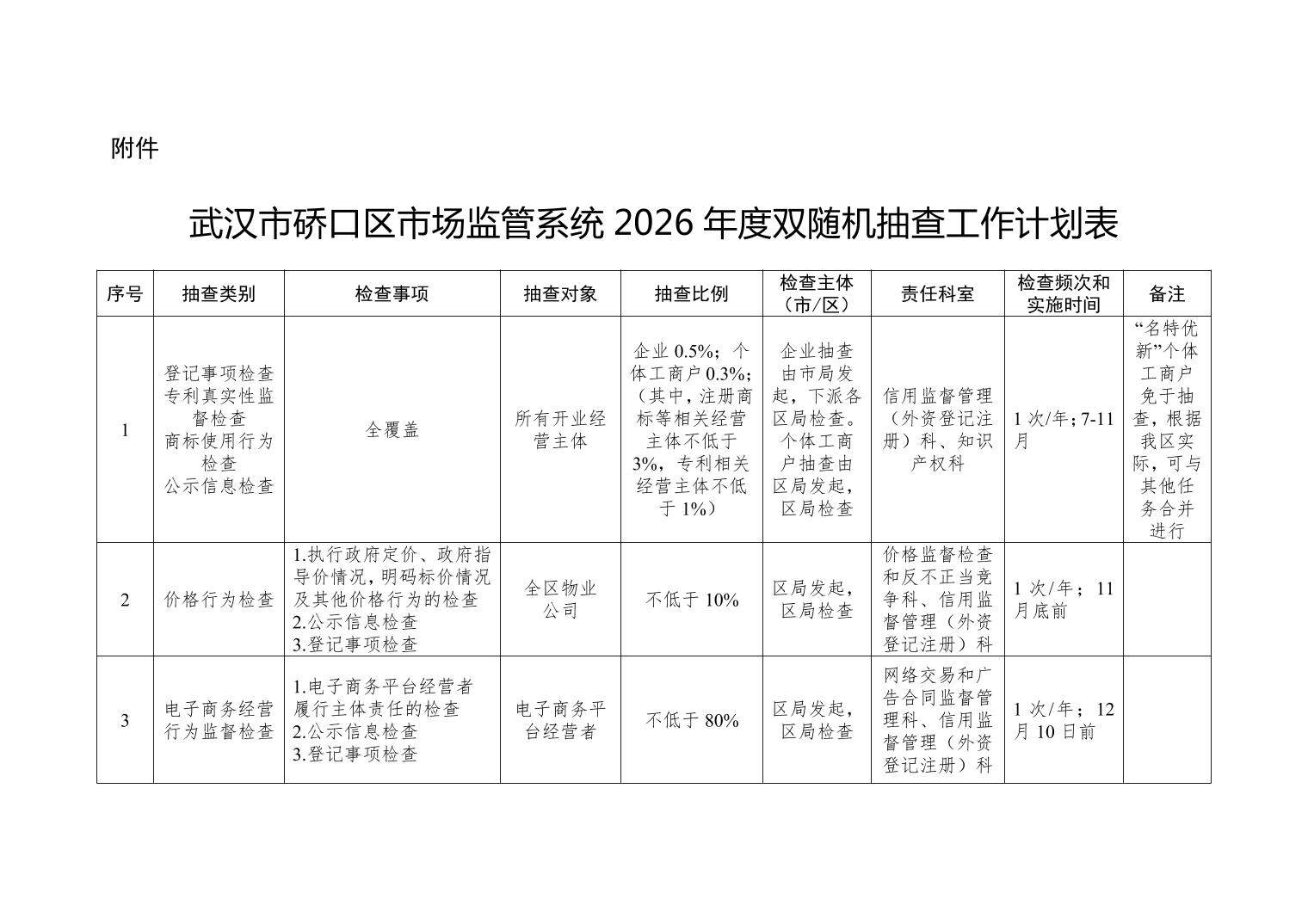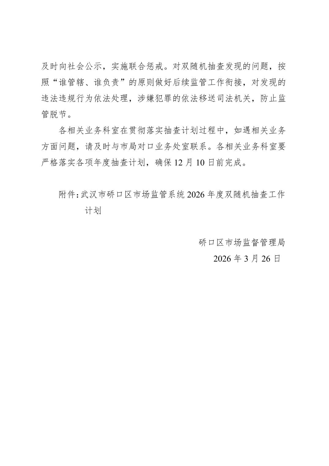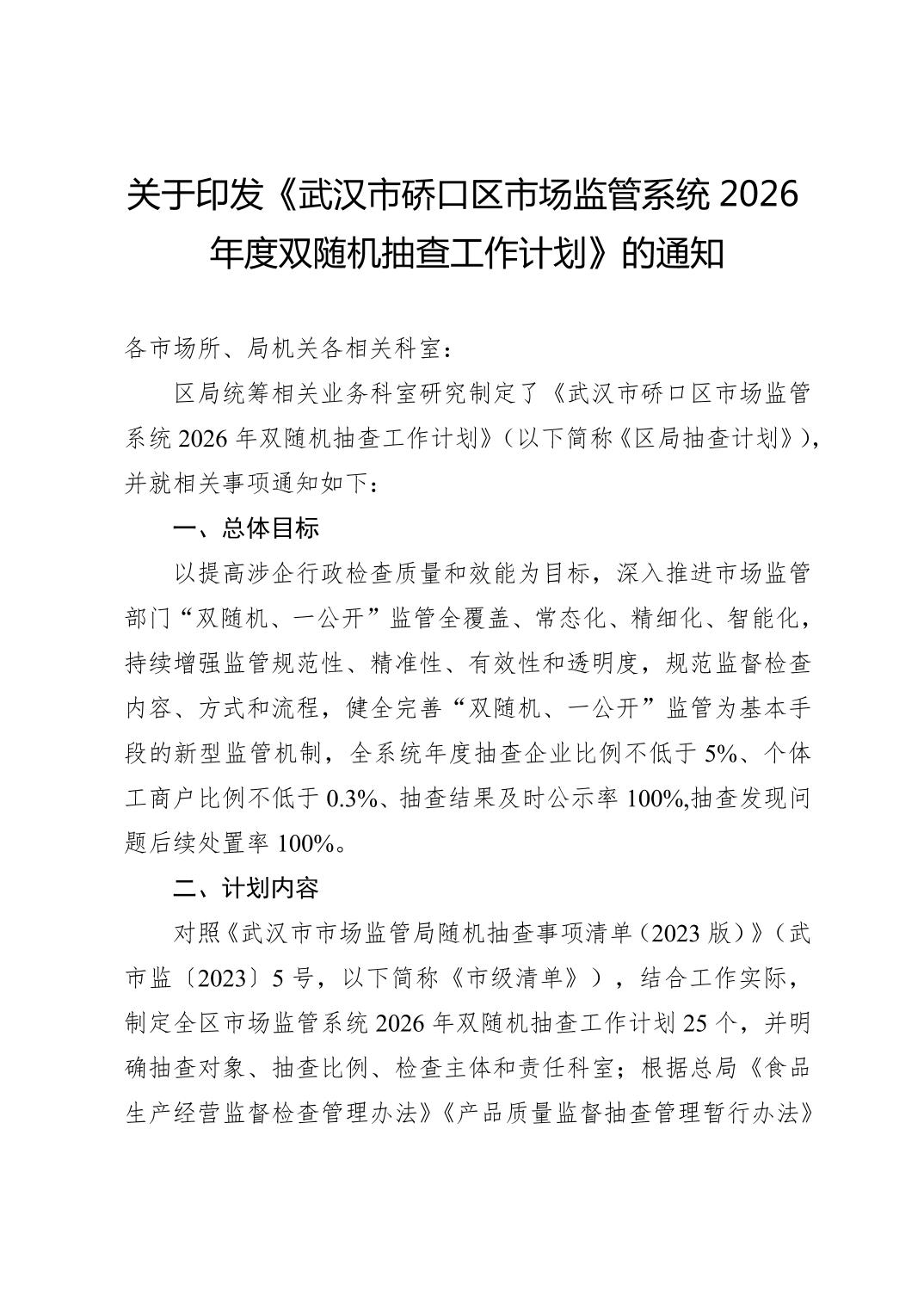 关于印发《武汉市硚口区市场监管系统2026年度双随机抽查工作计划》的通知