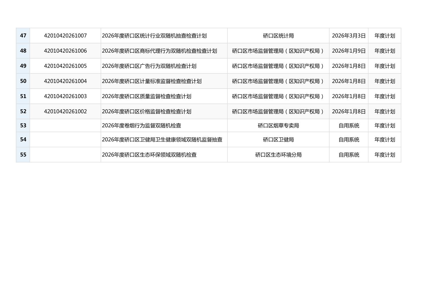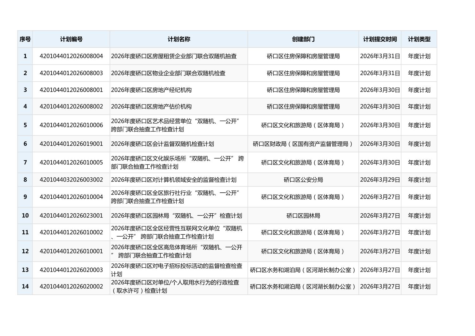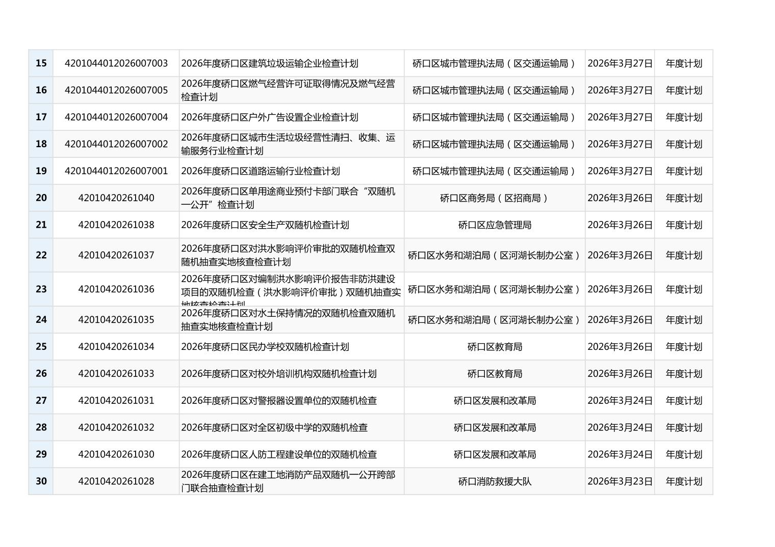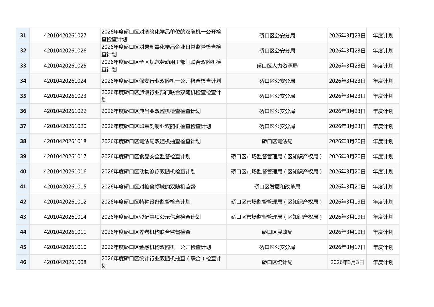 2026年度硚口区双随机抽查计划