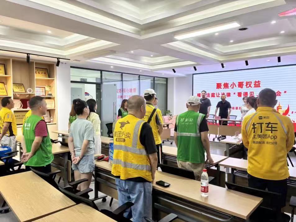 王律师结合模拟案例,深入解析新就业形态劳动者权益保护要点,引导骑手们提高自我风险防范意识。“以前不懂维权途径,这次模拟法庭让我体会到法律就在身边,知道了每周四社区都有值班律师能够提供帮助,以后遇到纠纷我会学着用法律保护自己。”朴朴超市外卖骑手小王表示收获很大。