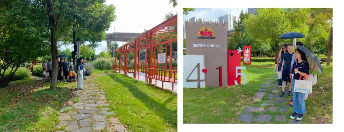 培训结束后,大家走进硚口法治宣传教育基地,体验一次别开生面的“沉浸式”学法增能之旅。讲解人员详细介绍了基地法治主题、设计理念、建造过程、文化内涵等内容,带领大家参观溯源广场、法治大道、禁毒长廊以及国安互动区等场域。漫步园林中,沿途的法治标牌吸引大家驻足观看,并不时拍照记录、交流讨论,在参观中不断拓宽法律视野。
